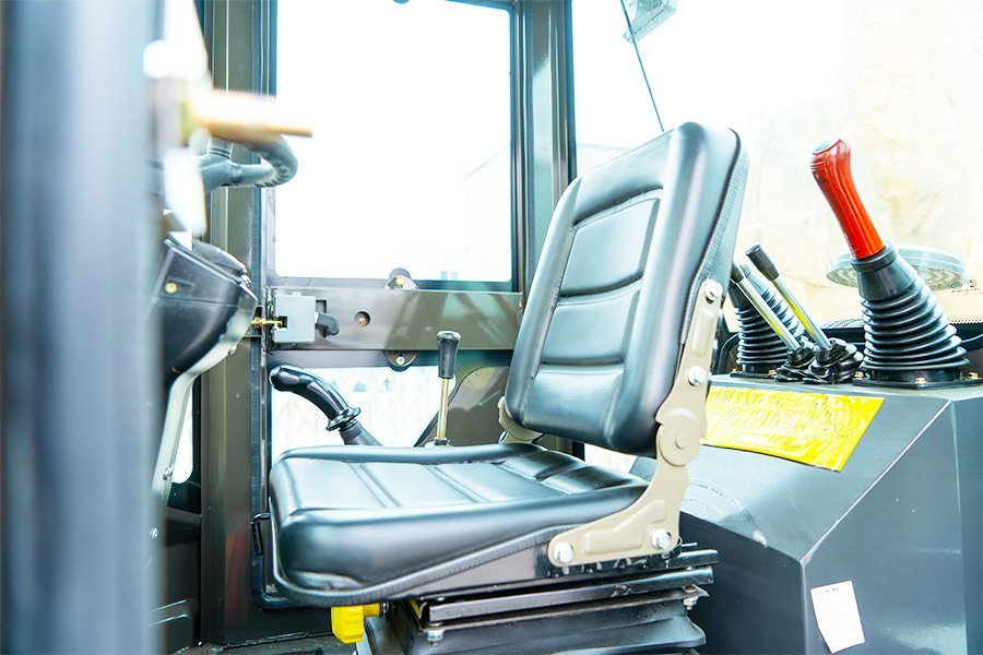 The suspended shock-absorbing 360-degree rotating seat with a seat belt improves the comfort and safety of the driver.